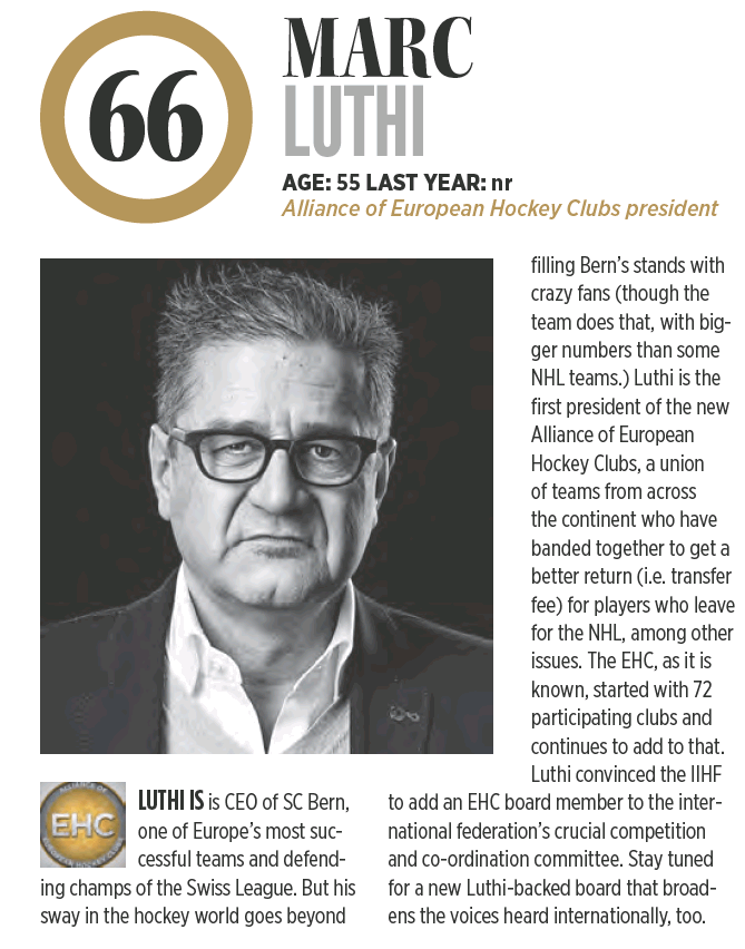 Et on retrouve en tête cette année un duo formé de Connor McDavid (1er) et Auston Matthews qui devancent un certain Garry Bettman. Carey Price est 8ème, Sidney Crosby 9ème et Wayne Gretzky 10ème. Autres mentions, René Fasel 27ème, Marc Bergevin 52ème, Marc Lüthi 66ème et Ralph Krueger au 83ème rang.