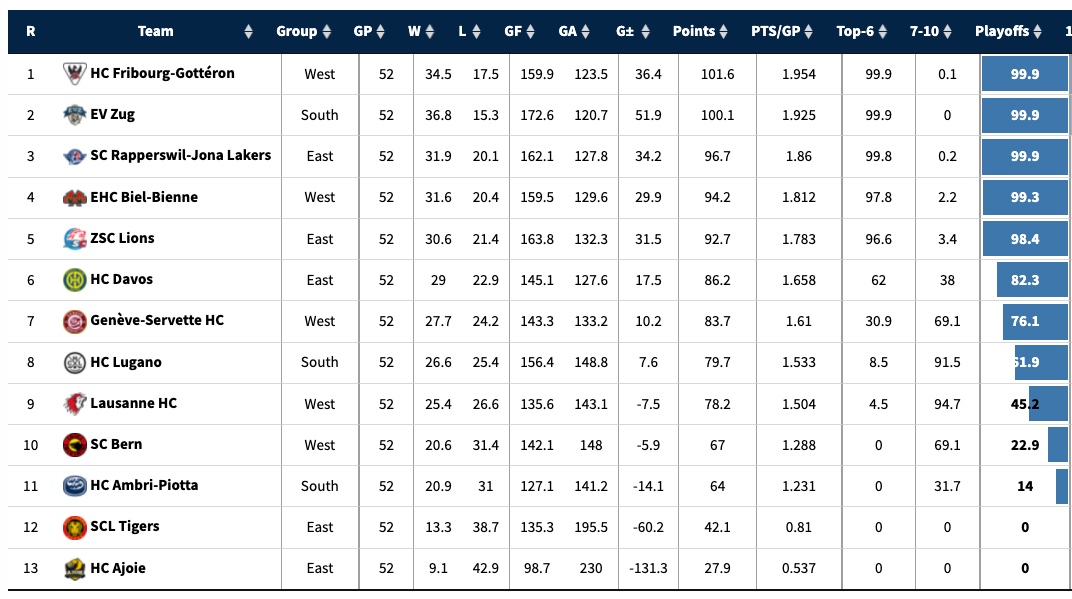 Chances de faire les play-offs et classement projeté en fin de saison régulière de National League