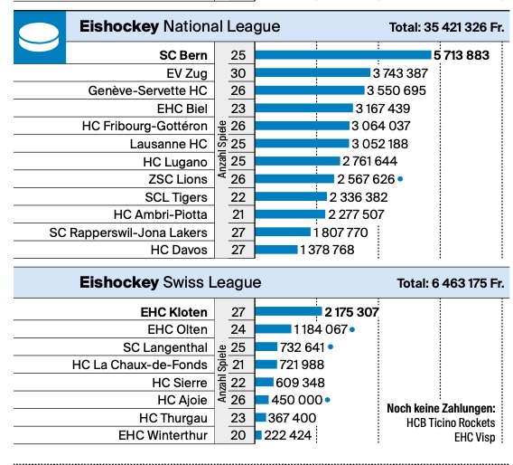 La Schweiz am Sonntag a publié les chiffres que voici, à noter que Davos n'a rien pu récupérer pour sa si importante Coupe Spengler et que le hockey a logiquement touché plus que le foot (30.5 millions), avec bien plus de matchs disputés dans une saison (les montants suivis d'un point peuvent encore évoluer à la hausse).
