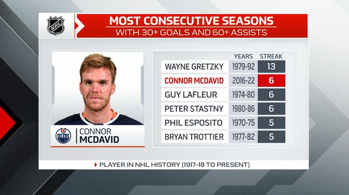 Connor McDavid signe une 6e saison avec au moins trente buts et soixante assists