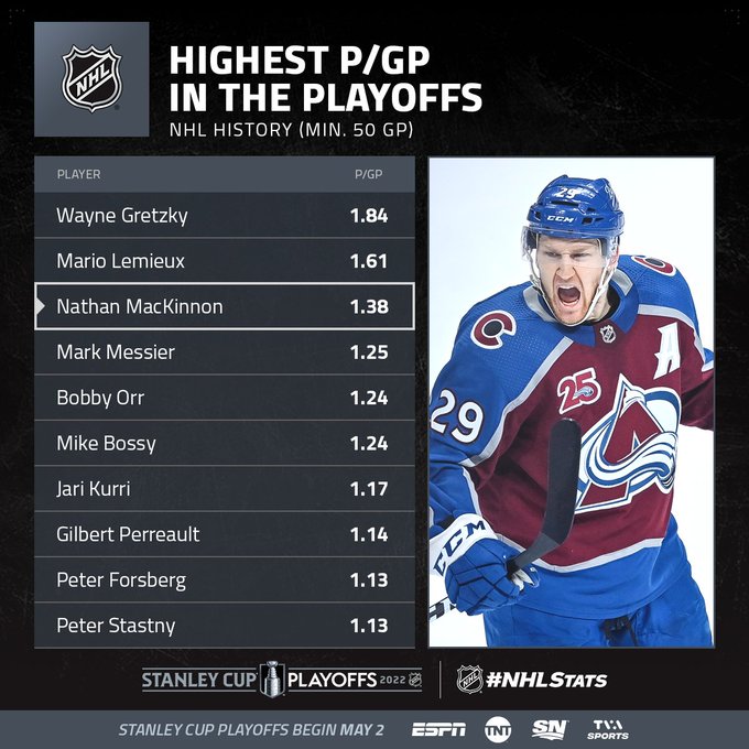 Nathan MacKinnon (24-50-74 en 54 GP) a marqué deux fois et sa moyenne est de 1,37 points par match en 2021-22. Seuls deux joueurs dans l'histoire de l'équipe de l'Avalanche ont produit un tel rythme plus élevé en une seule saison (min. 40 GP) : Joe Sakic (1,46 en 1995-96 et 1,44 en 2000-01) et Peter Forsberg (1,41 en 1995-96 et 2002-03).