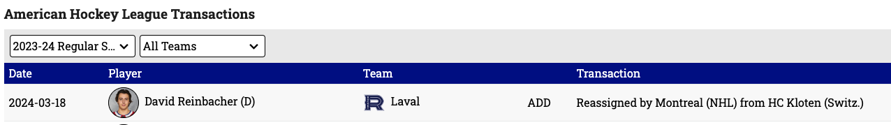 David Reinbacher a été enregistré aujourd'hui en American Hockey League et pourra donc profiter en tout cas de la fin du championnat des Rockets de Laval.