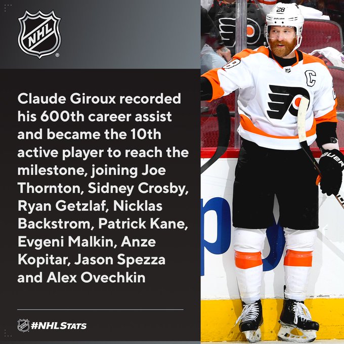 Claude Giroux (284-600-884) a enregistré sa 600e passe décisive en carrière et son 884e point pour dépasser Bill Barber (420-463-883) au deuxième rang de la liste des points de l'hsitoire des Flyers.
