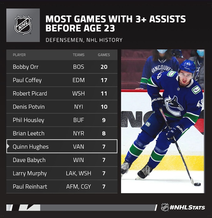 Quinn Hughes (0-3-3) a enregistré son septième match de trois passes en saison régulière. Seuls six défenseurs dans l'histoire de la LNH ont enregistré plus de matchs à trois passes décisives avant leur 23e anniversaire : Bobby Orr (20), Paul Coffey (17), Robert Picard (11), Denis Potvin (10), Phil Housley (9) et Brian Leetch (8).