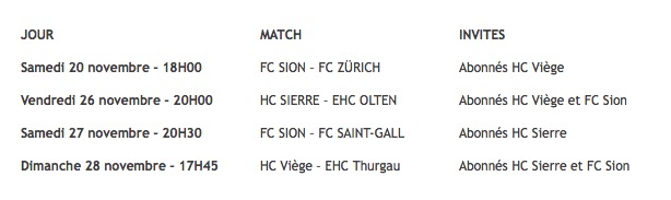 Concrètement, les trois clubs ont décidé d’ouvrir leur gradin aux abonnés des autres équipes valaisannes. Cette action exceptionnelle se déroulera sur deux week-ends, le 20 novembre et les 26-27-28 novembre (voir plan ci-dessous). De plus, une visibilité des logos sera observable sur les équipements de chaque équipe lors de ces deux week-ends.