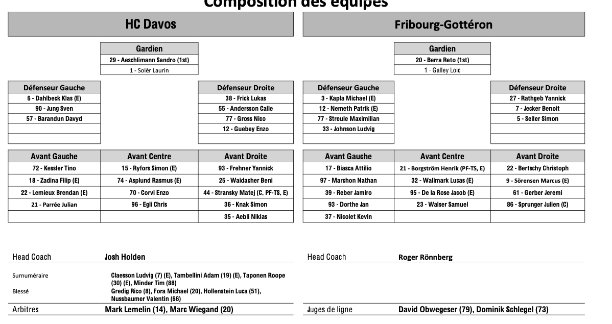 Il y a une heure Formation des équipes et joueurs indisponibles pour l'acte final entre Davos et Fribourg