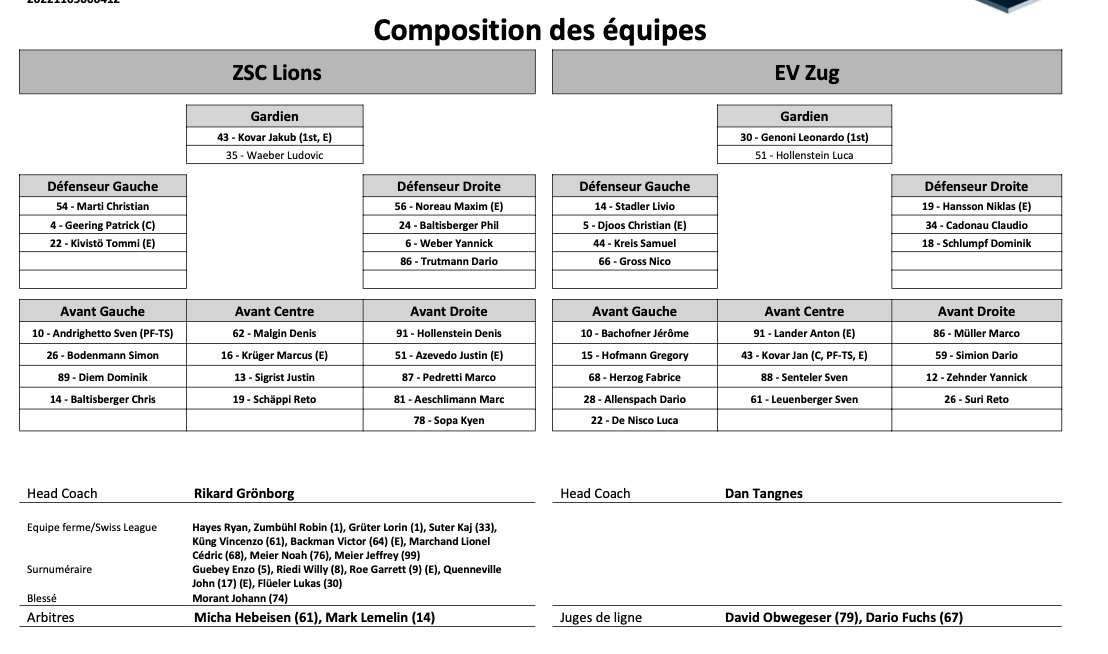 Formation des équipes et joueurs indisponibles pour l'acte II entre Zurich et Zoug 20/04/2022 Follow SwissHabs Derniers articles Il y a une heure Un combat de gardiens en LHJMQ Il y a une heure Fin de saison pour Auston Matthews Il y a une heure Les autres faits à retenir de cette nuit de NHL et de celle à venir Il y a 2 heures Un record de but pour Lars Steiner, une soirée très occupée pour Christian Kirsch Il y a 2 heures Un dixième but pour Pius Suter qui mène à la victoire des Blues sur les Oilers