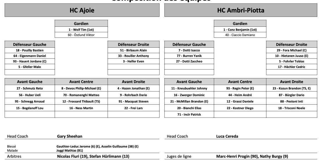 Formation des équipes et joueurs indisponibles pour le match Ajoie vs Ambri 18/09/2021 Follow SwissHabs Derniers articles Il y a 28 minutes Les autres faits à retenir de cette nuit de NHL et de celle à venir Il y a 45 minutes Dan Tangnes signe un bien bel exploit avec Rögle Il y a 59 minutes Une 21e saison à plus d'un point par match pour Sidney Crosby Il y a une heure Les Devils stoppent la série du Canadien Il y a une heure Saison terminée pour Maxime Sauthier, les Huskies devront passer par un septième match