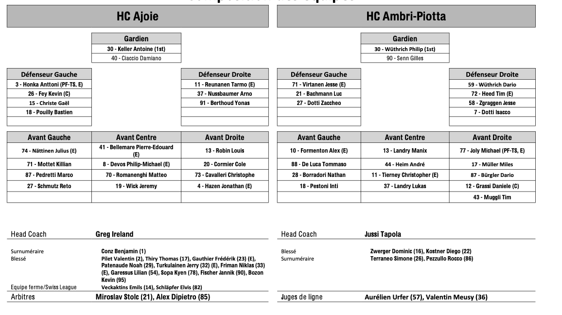 Formation des équipes et joueurs indisponibles pour le match Ajoie vs Ambri 05/03/2026 Follow SwissHabs Derniers articles Il y a une heure Formation des équipes et joueurs indisponibles pour le match Lugano vs Zurich Il y a une heure Formation des équipes et joueurs indisponibles pour le match Lausanne vs Davos Il y a une heure Formation des équipes et joueurs indisponibles pour le match Rapperswil vs Kloten Il y a une heure Les Maple Leafs concluent un échange avec Colorado Il y a 2 heures Formation des équipes et joueurs indisponibles pour le match Berne vs Zoug