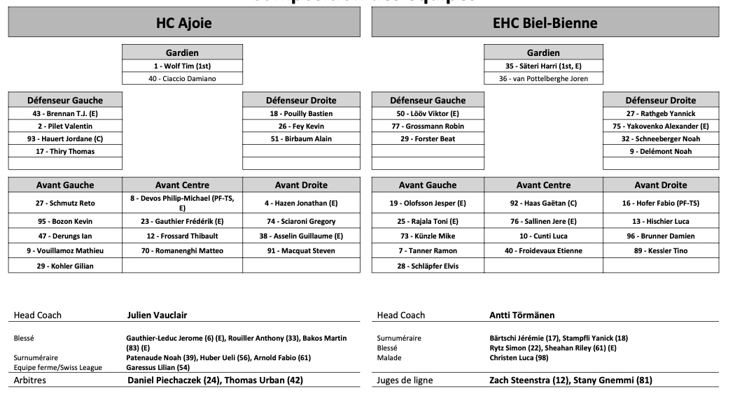 Formation des équipes et joueurs indisponibles pour le match Ajoie vs Bienne 28/01/2023 Follow SwissHabs Derniers articles Il y a 3 minutes Comment Sierre prépare son éventuelle promotion en National League Il y a 52 minutes Trois nouveaux intronisés au Hall of Fame de Genève Il y a 2 heures Women's League : début des pré-play-offs, les play-out n’auront pas lieu Il y a 2 heures Les autres faits à retenir de cette nuit de NHL et de celle à venir Il y a 3 heures Connor McDavid atteint les 100 points pour une sixième saison consécutive