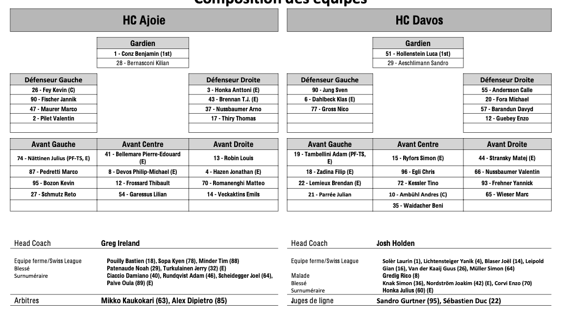 Formation des équipes et joueurs indisponibles pour le match Ajoie vs Davos 14/02/2025 Follow SwissHabs Derniers articles Il y a 8 heures Davos pourrait signer un nouveau record de National League Il y a 10 heures Rikard Grönborg ne pourra plus parler à ses joueurs trois matchs durant Il y a 11 heures Martin Filander continuera sans doute son parcours en Suède Il y a 12 heures Jacob de la Rose incertain pour le match de demain Il y a 13 heures Fribourg-Gottéron engage un nouvel étranger