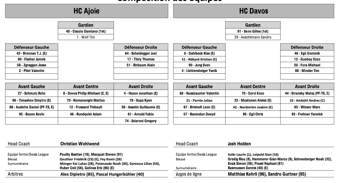 Formation des équipes et joueurs indisponibles pour le match Ajoie vs Davos 04/03/2024 Follow SwissHabs Derniers articles Il y a 6 heures Plusieurs joueurs touchés du côté de Davos Il y a 8 heures Kevin Fiala aura un nouveau coach Il y a 9 heures Pavel Rosa restera lui aussi derrière le banc du CP Berne Il y a 11 heures Simas Ignatavicius, itinéraire d’un enfant drafté Il y a 14 heures Les Swiss Devils célèbrent la cuisine helvète au New Jersey