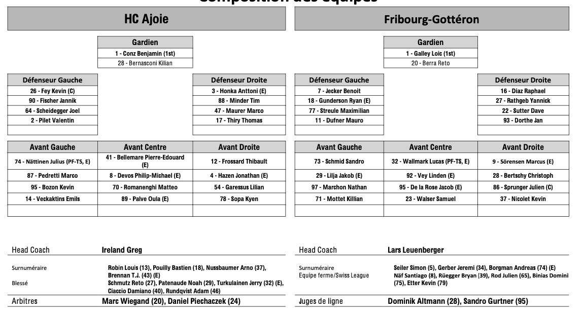 Formation des équipes et joueurs indisponibles pour le match Ajoie vs Fribourg 17/01/2025 Follow SwissHabs Derniers articles Il y a 54 minutes Les Swiss Devils célèbrent la cuisine helvète au New Jersey Il y a 2 heures Un match de suspension et une amende contre Jakob Lee Il y a 3 heures Davos et Fribourg joueront la ligue des champions Il y a 3 heures Ouverture d'une procédure ordinaire contre Malte Strömwall Il y a 4 heures Emil Pettersson suscite de l'intérêt sur le marché suisse
