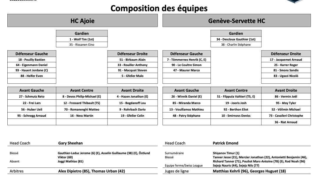 Formation des équipes et joueurs indisponibles pour le match Ajoie vs Genève 25/09/2021 Follow SwissHabs Derniers articles Il y a 5 heures Des sanctions contre Sandro Aeschlimann, Igor Jelovac, Marlon Graf et Julien Sprunger Il y a 6 heures Chris McSorley et Genève-Servette renvoyés dos à dos Il y a 7 heures Nicole Vallario et les Sirens jouent devant 18'000 fans dans une arène mythique Il y a 9 heures Andres Ambühl va prendre une place importante dans la Coupe Spengler Il y a 9 heures Les autres faits à retenir de cette nuit de NHL