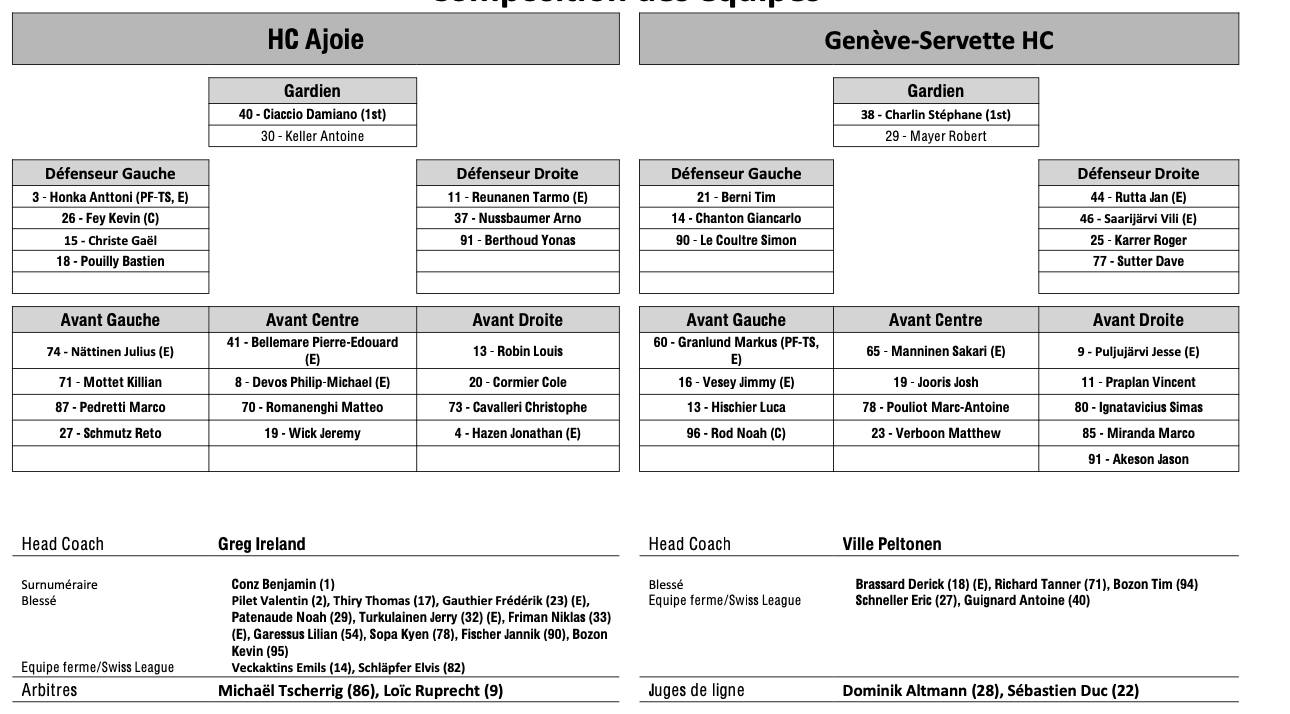 Formation des équipes et joueurs indisponibles pour le match Ajoie vs Genève 07/03/2026 Follow SwissHabs Derniers articles Il y a 35 minutes Formation des équipes et joueurs indisponibles pour le match Zurich vs Davos Il y a une heure Formation des équipes et joueurs indisponibles pour le match Bienne vs Langnau Il y a une heure Formation des équipes et joueurs indisponibles pour le match Fribourg vs Lausanne Il y a une heure Formation des équipes et joueurs indisponibles pour le match Zoug vs Rapperswil Il y a une heure Formation des équipes et joueurs indisponibles pour le match Ambri vs Berne