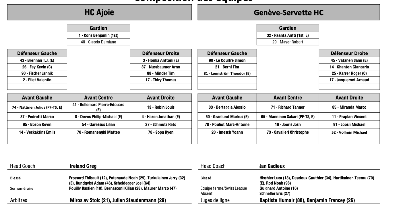 Formation des équipes et joueurs indisponibles pour le match Ajoie vs Genève 23/12/2024 Follow SwissHabs Derniers articles Il y a une heure Peter Cajka nous livre ses impressions sur cette fin de saison régulière Il y a 4 heures Chris DiDomenico ne devrait plus reporter le maillot d'Ambri Il y a 4 heures Saison terminée pour Luca Hollenstein, un remplaçant déjà trouvé Il y a 4 heures Coire prolonge son buteur Liekit Reichle Il y a 6 heures Les autres faits à retenir de cette nuit de NHL et de celle à venir
