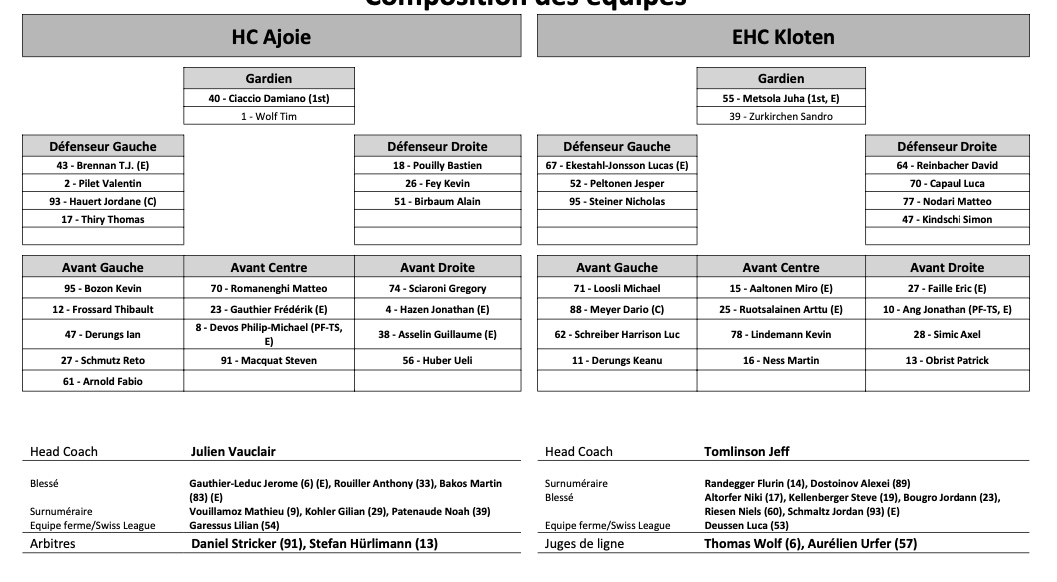 Formation des équipes et joueurs indisponibles pour le match Ajoie vs Kloten 31/01/2023 Follow SwissHabs Derniers articles Il y a 27 minutes Christian Dubé fait le point sur ses débuts avec le HC Bienne Il y a 53 minutes Le combat de Jason Zucker vs Jonas Siegenthaler en images Il y a 2 heures Ian Michtell devrait rejoindre Berne la saison prochaine Il y a 6 heures Le point sur l'infirmerie du HC Bienne Il y a 7 heures Trois nouveaux intronisés au Hall of Fame de Genève