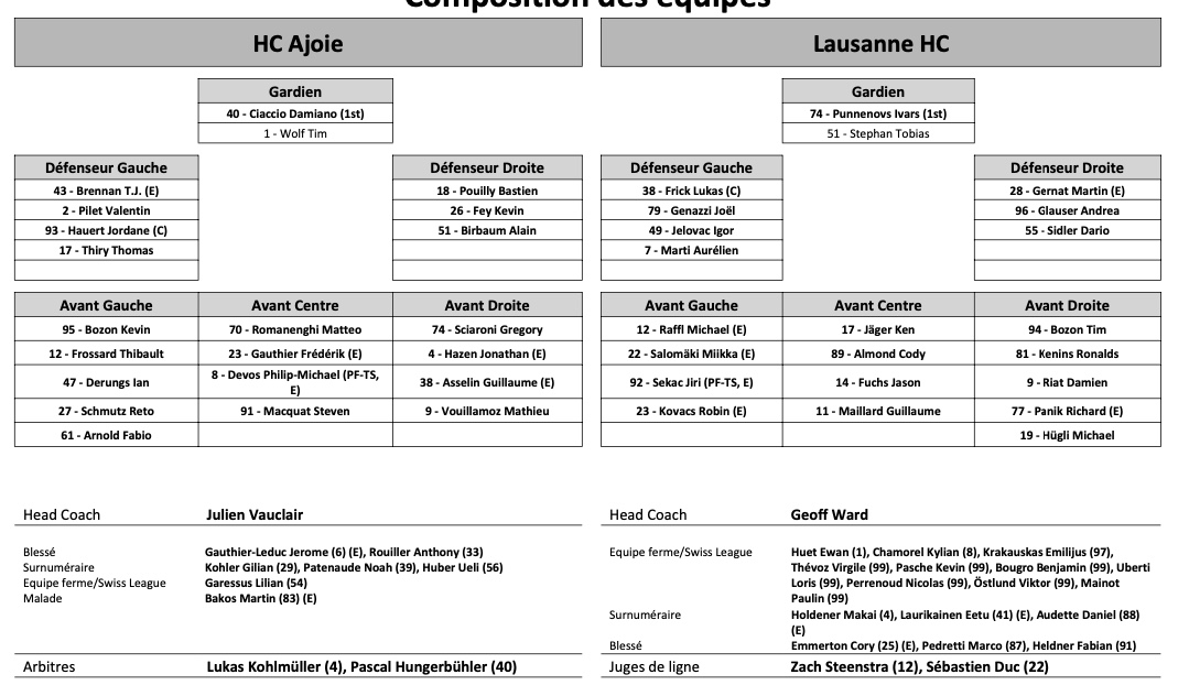 Formation des équipes et joueurs indisponibles pour le match Ajoie vs Lausanne 04/02/2023 Follow SwissHabs Derniers articles Il y a 5 heures Formation des équipes et joueurs indisponibles pour le match Bienne vs Zoug Il y a 5 heures Formation des équipes et joueurs indisponibles pour le match Rapperswil vs Fribourg Il y a 5 heures Formation des équipes et joueurs indisponibles pour le match Kloten vs Langnau Il y a 5 heures Formation des équipes et joueurs indisponibles pour le match Lausanne vs Zurich Il y a 5 heures Formation des équipes et joueurs indisponibles pour le match Ajoie vs Lugano