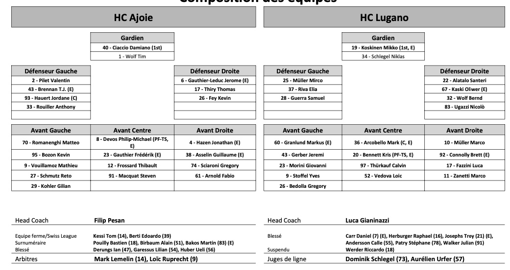 Formation des équipes et joueurs indisponibles pour le match Ajoie vs Lugano 21/10/2022 Follow SwissHabs Derniers articles Il y a 10 heures Zoug dévoile son nouveau logo Il y a 10 heures Deux prolongations à Zurich Il y a 12 heures Formation des équipes et joueurs indisponibles pour le match Zurich vs Genève Il y a 12 heures Formation des équipes et joueurs indisponibles pour le match Davos vs Kloten Il y a 12 heures Formation des équipes et joueurs indisponibles pour le match Lugano vs Lausanne