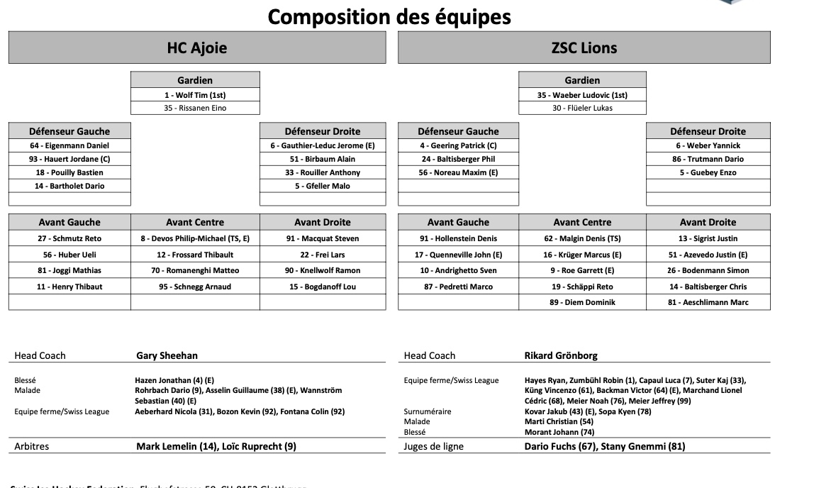 Formation des équipes et joueurs indisponibles pour le match Ajoie vs Zurich 15/01/2022 Follow SwissHabs Derniers articles Il y a une heure Quel est le prix à payer pour suivre un match de hockey en famille ? Il y a 2 heures Les lionnes lausannoises reviennent sur leur titre Il y a 3 heures Les faits à retenir de cette petite nuit de NHL et de celle à venir Il y a 9 heures Resumé des matchs de la soirée en National League Il y a 14 heures Formation des équipes et joueurs indisponibles pour le match Lugano vs Zurich