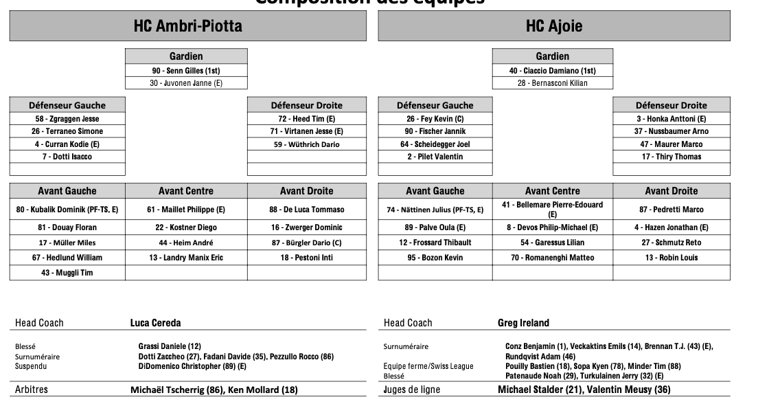 Formation des équipes et joueurs indisponibles pour le match Ambri vs Ajoie 15/02/2025 Follow SwissHabs Derniers articles Il y a 6 heures Davos pourrait signer un nouveau record de National League Il y a 9 heures Rikard Grönborg ne pourra plus parler à ses joueurs trois matchs durant Il y a 10 heures Martin Filander continuera sans doute son parcours en Suède Il y a 10 heures Jacob de la Rose incertain pour le match de demain Il y a 12 heures Fribourg-Gottéron engage un nouvel étranger