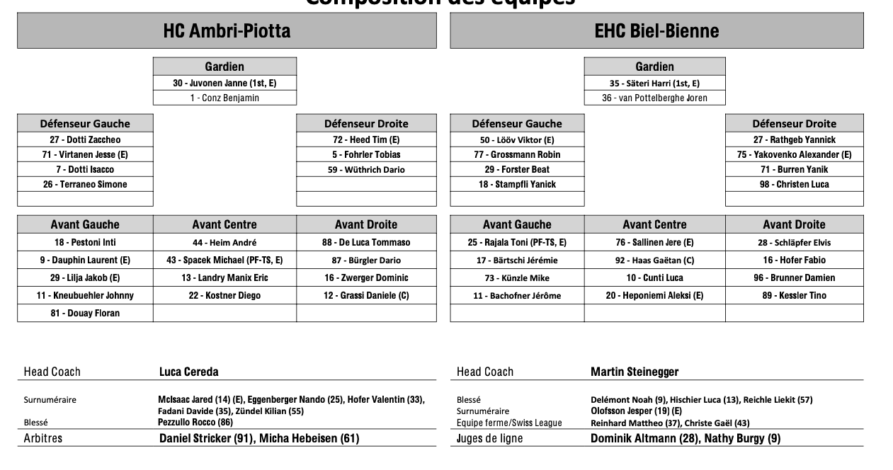 Formation des équipes et joueurs indisponibles pour le match Ambri vs Bienne 13/03/2024 Follow SwissHabs Derniers articles Il y a 13 minutes Mauvais timing pour aller chercher sa crosse Il y a 18 minutes Un combat de gardien en AHL Il y a 29 minutes Alina Müller enchaîne sur ses bases olympiques Il y a 39 minutes Hischier et Meier marquent dans la victoire des Devils Il y a 11 heures Zoug dévoile son nouveau logo