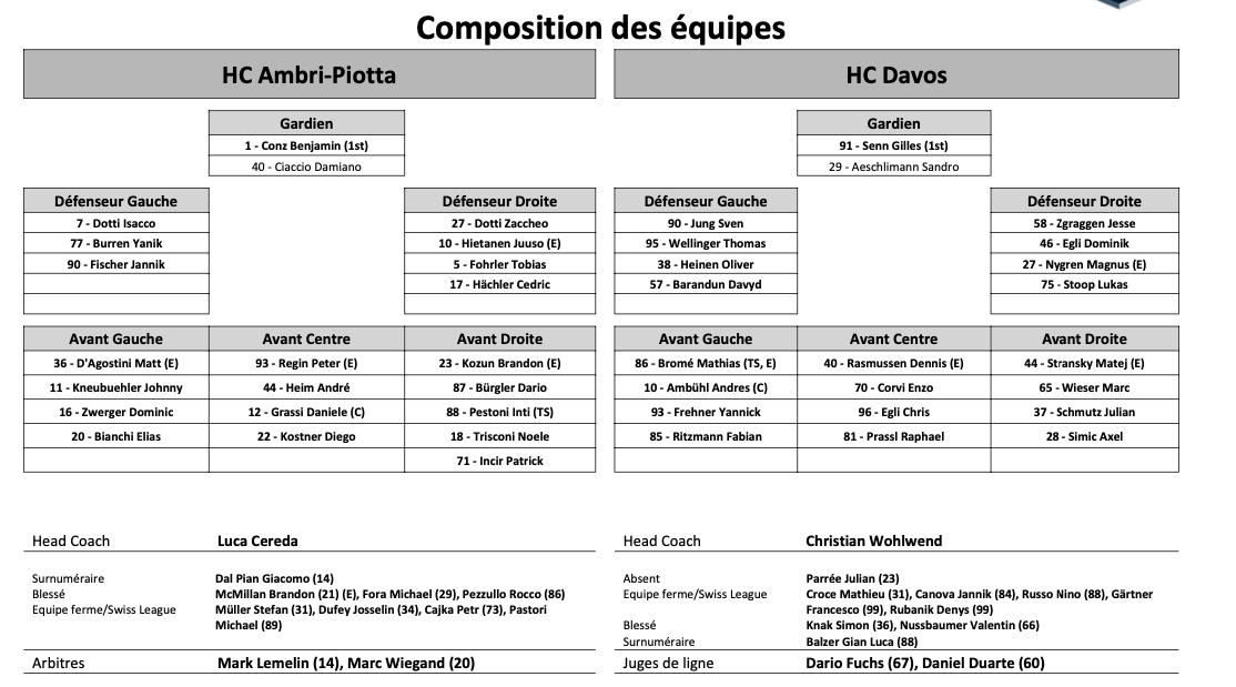 Formation des équipes et joueurs indisponibles pour le match Ambri vs Davos 06/11/2021 Follow SwissHabs Derniers articles Il y a 46 minutes Les autres faits à retenir de cette nuit de NHL Il y a 47 minutes Ovechkin défie le temps et entre encore dans l’histoire Il y a une heure Un rare combat de gardiens en NHL Il y a une heure Le point sur les play-offs de Canadian Hockey League Il y a une heure Une soirée à oublier pour nos Suisses de NHL
