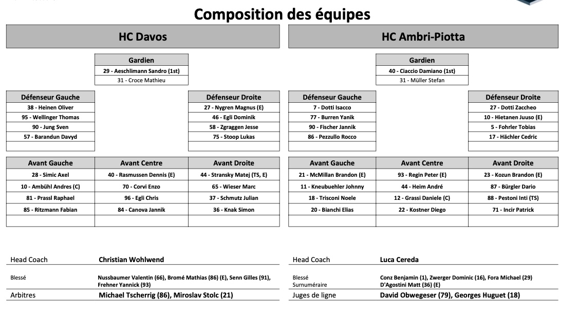 Formation des équipes et joueurs indisponibles pour le match Davos vs Ambri 05/12/2021 Follow SwissHabs Derniers articles Il y a 56 minutes Finale de Swiss League acte I : formation des équipes et joueurs indisponibles pour le match Sierre vs La Chaux-de-Fonds Il y a 2 heures « Une phase de transition » : Reto Kläy fait le point après l’élimination et se met à la quête d'un coach Il y a 3 heures Pour le plaisir : le bien joli but de Matthew Tkachuk Il y a 4 heures Arosa prend congé de quatre joueurs Il y a 5 heures Houston toujours plébiscité par les joueurs pour une nouvelle franchise de NHL, Paris un peu moins populaire