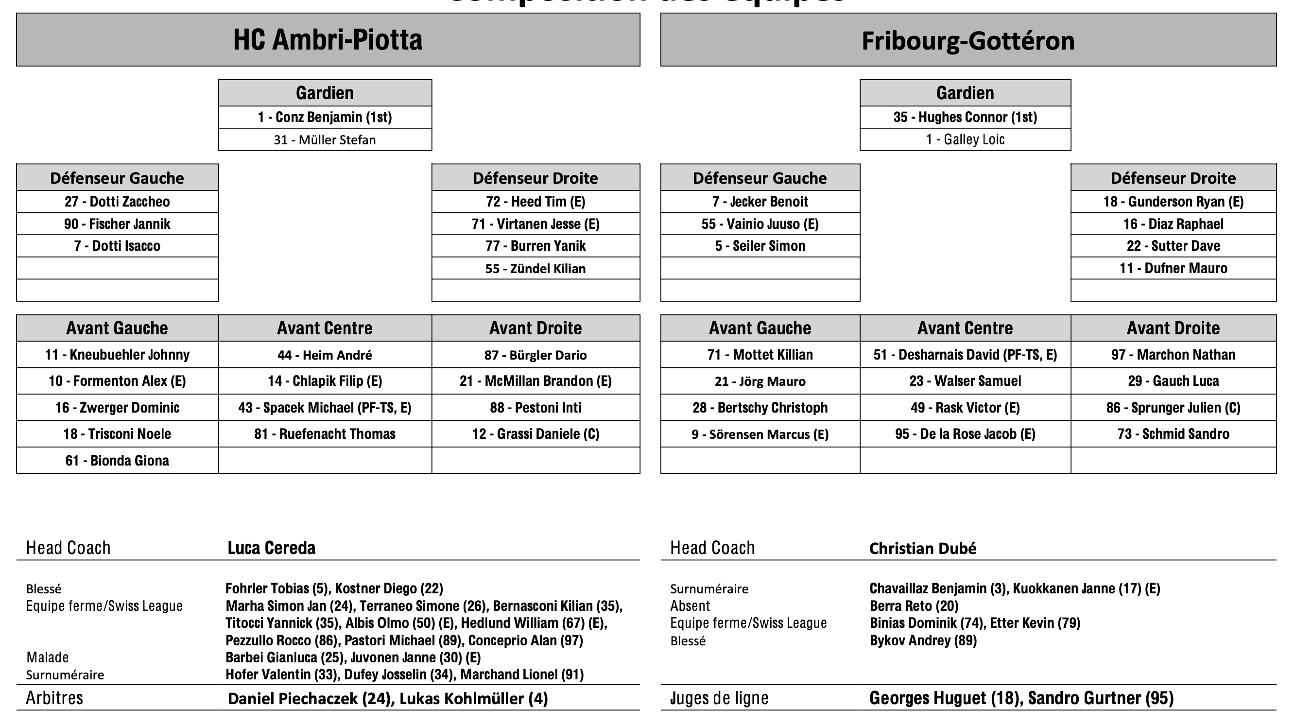 Formation des équipes et joueurs indisponibles pour le match Ambri vs Fribourg 17/02/2023 Follow SwissHabs Derniers articles Il y a 4 heures Zoug dévoile son nouveau logo Il y a 4 heures Deux prolongations à Zurich Il y a 6 heures Formation des équipes et joueurs indisponibles pour le match Zurich vs Genève Il y a 6 heures Formation des équipes et joueurs indisponibles pour le match Davos vs Kloten Il y a 6 heures Formation des équipes et joueurs indisponibles pour le match Lugano vs Lausanne