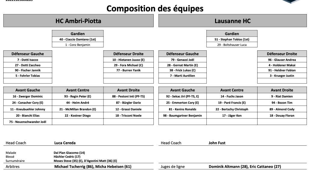 Formation des équipes et joueurs indisponibles pour le match Ambri vs Lausanne 25/02/2022 Follow SwissHabs Derniers articles Il y a 5 minutes Zoug récupère Andreas Wingerli pour les play-offs Il y a 39 minutes Fribourg Gottéron face à Rapperswil pour le titre de champion de Suisse Il y a 2 heures Thierry Paterlini ne sait pas encore s'il prolongera avec Langnau Il y a 4 heures Les autres faits à retenir de cette nuit de NHL et de celle à venir Il y a 5 heures Damiano Ciaccio n’est pas encore prêt à raccrocher les patins