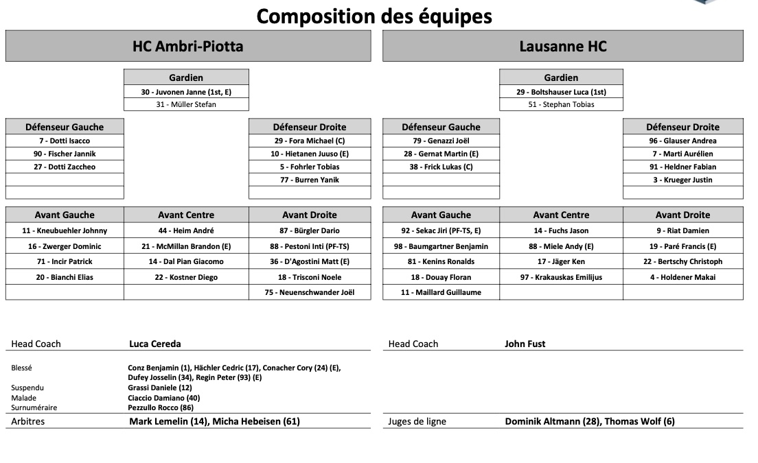 Formation des équipes et joueurs indisponibles pour le match Ambri vs Lausanne 20/03/2022 Follow SwissHabs Derniers articles Il y a 9 minutes Les stats de Macklin Celebrini et Connor McDavid lors de leurs 135 premiers matchs Il y a 35 minutes Roman Josi à l'interview Il y a 44 minutes OHL : un record pour Christian Kirsch et les Rangers Il y a 52 minutes Une victoire aux tirs au but pour les Predators Il y a 9 heures Langnau confirme le départ de plusieurs joueurs