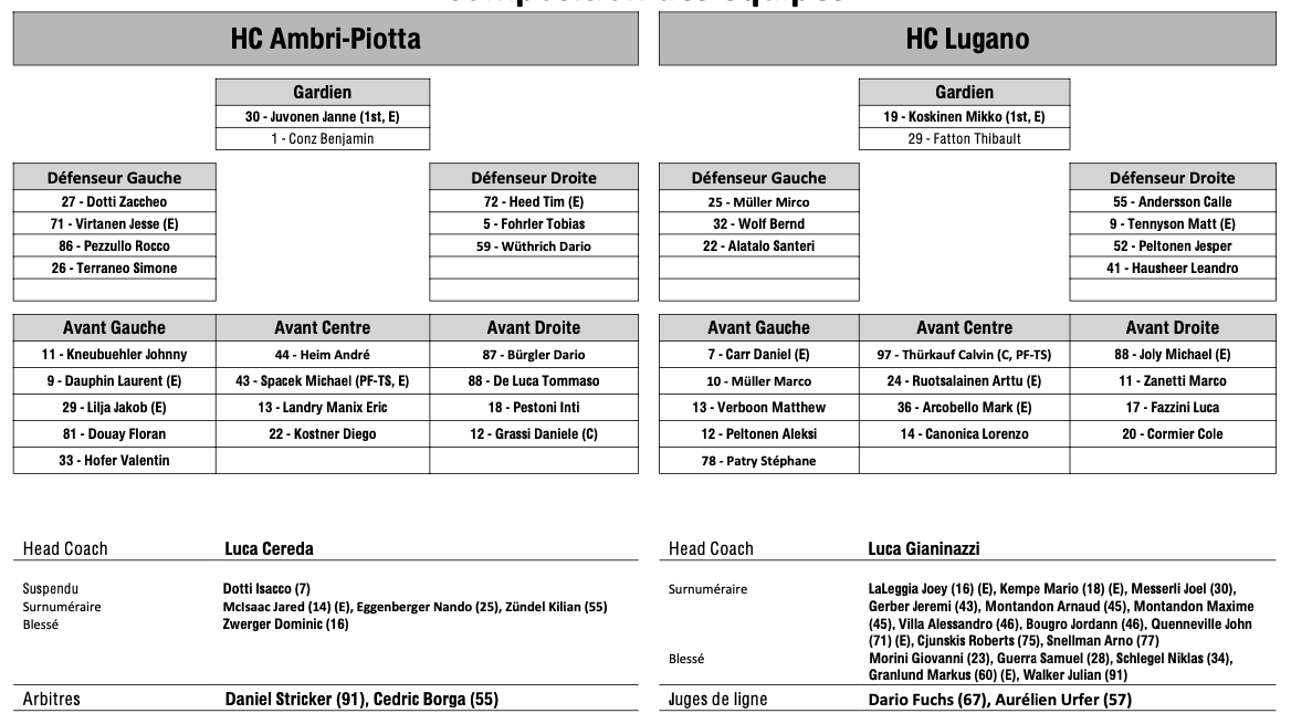 Formation des équipes et joueurs indisponibles pour le match Ambri vs Lugano 07/03/2024 Follow SwissHabs Derniers articles Il y a 47 minutes Plusieurs joueurs touchés du côté de Davos Il y a 2 heures Kevin Fiala aura un nouveau coach Il y a 3 heures Pavel Rosa restera lui aussi derrière le banc du CP Berne Il y a 5 heures Simas Ignatavicius, itinéraire d’un enfant drafté Il y a 9 heures Les Swiss Devils célèbrent la cuisine helvète au New Jersey