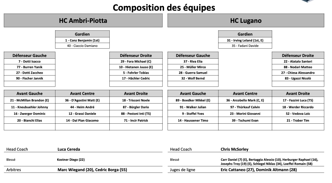 Formation des équipes et joueurs indisponibles pour le match Ambri vs Lugano 15/10/2021 Follow SwissHabs Derniers articles Il y a 14 minutes Kay Schweri pourrait retrouver les montagnes neuchâteloises Il y a 33 minutes NHL : deux autres équipes éliminées de la course aux play-offs Il y a 39 minutes Patrick Kane signe le record de meilleur pointeur américain de NHL Il y a 52 minutes Christian Kirsch et les Rangers balaient leur série Il y a une heure Bonne opération pour les Devils