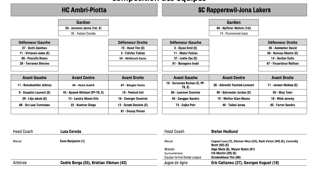Formation des équipes et joueurs indisponibles pour le match Ambri vs Rapperswil 16/02/2024 Follow SwissHabs Derniers articles Il y a 41 minutes Les autres faits à retenir de cette nuit de NHL et de celle à venir Il y a une heure U18-Elit et U21-Elit : début des play-offs et du tour de classement Il y a 2 heures Un doublé et une première étoile pour Lian Bichsel Il y a 3 heures Personne n'a voulu de Chris DiDomenico en Suisse, la position de Jussi Tapola est également fragilisée Il y a 4 heures Quelques semaines d'absence pour Nino Niederreiter