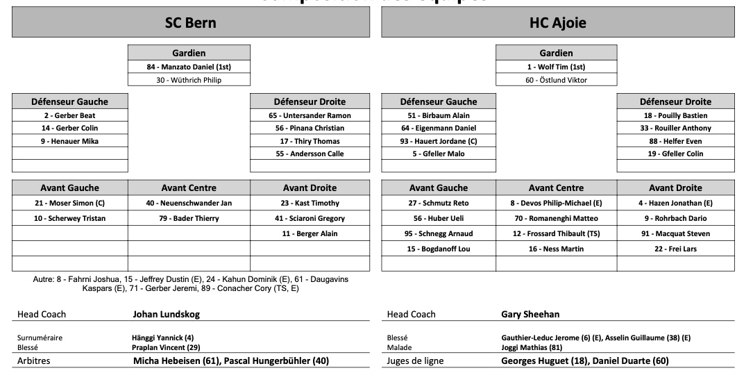 Formation des équipes et joueurs indisponibles pour le match Berne vs Ajoie 21/09/2021 Follow SwissHabs Derniers articles Il y a 8 heures Les Islanders changent de cap : Peter DeBoer remplace Patrick Roy Il y a 15 heures Des sanctions contre Sandro Aeschlimann, Igor Jelovac, Marlon Graf et Julien Sprunger Il y a 16 heures Chris McSorley et Genève-Servette renvoyés dos à dos Il y a 17 heures Nicole Vallario et les Sirens jouent devant 18'000 fans dans une arène mythique Il y a 19 heures Andres Ambühl va prendre une place importante dans la Coupe Spengler