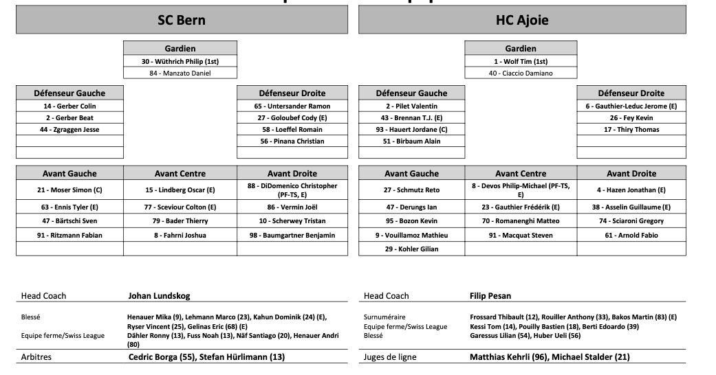 Formation des équipes et joueurs indisponibles pour le match Berne vs Ajoie 01/11/2022 Follow SwissHabs Derniers articles Il y a 33 minutes Les autres faits à retenir de cette nuit de NHL et de celle à venir Il y a 58 minutes Un nouveau record d'affluence pour un match féminin aux États-Unis Il y a une heure Lars Steiner et Guus Van der Kaaij trouvent le fond des filets Il y a une heure Akira Schmid et les Golden Knights défaits par les Capitals Il y a 8 heures La saison de NHL de Nino Niederreiter serait terminée