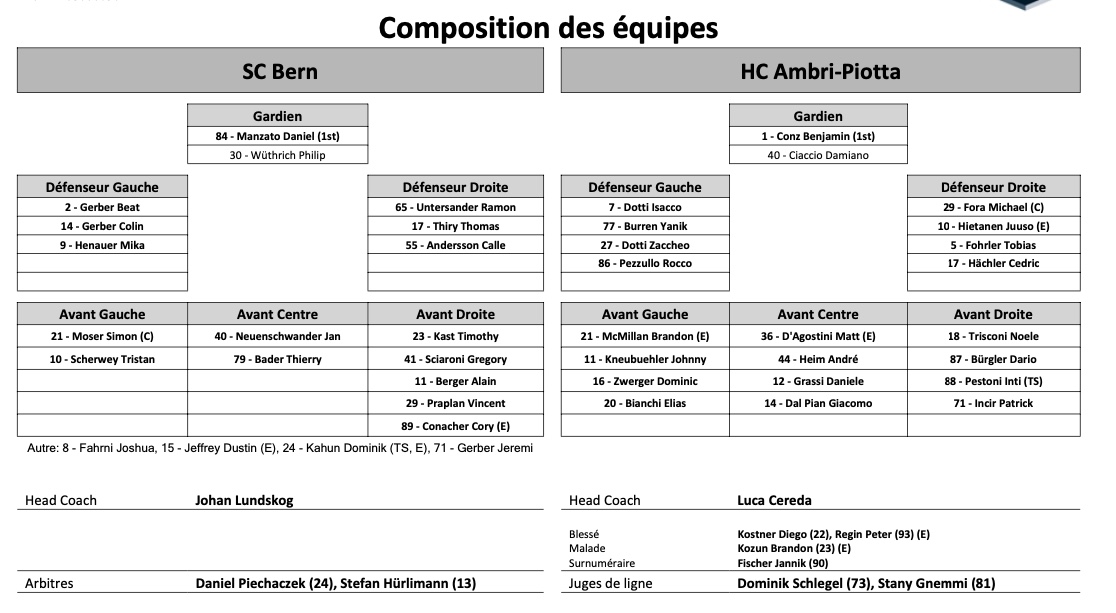 Formation des équipes et joueurs indisponibles pour le match Berne vs Ambri 16/10/2021 Follow SwissHabs Derniers articles Il y a 6 heures Genève file également en demi finale Il y a 10 heures Formation des équipes et joueurs indisponibles pour le match Genève vs Lausanne Il y a 10 heures Finale de Swiss League acte III : formation des équipes et joueurs indisponibles pour le match Sierre vs La Chaux-de-Fonds Il y a 11 heures L'équipe universitaire de retour pour deux ans à la Coupe Spengler Il y a 13 heures Champions Hockey League : les challengers