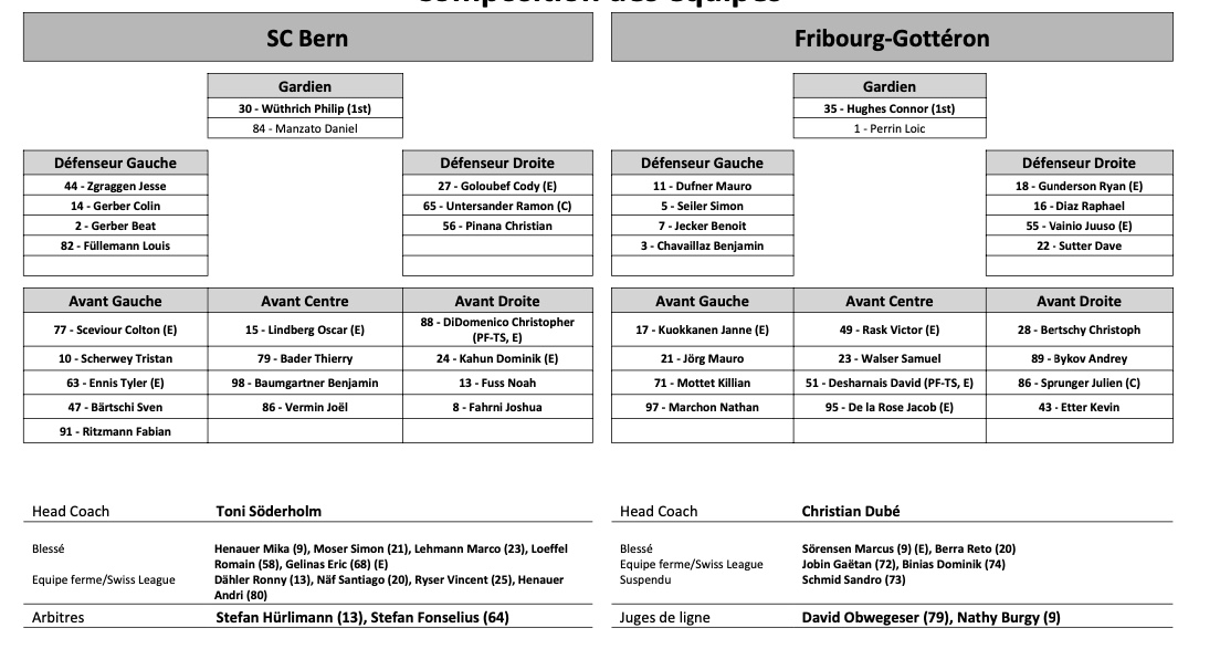 Formation des équipes et joueurs indisponibles pour le match Berne vs Fribourg 28/01/2023 Follow SwissHabs Derniers articles Il y a une heure Trois nouveaux intronisés au Hall of Fame de Genève Il y a 2 heures Women's League : début des pré-play-offs, les play-out n’auront pas lieu Il y a 2 heures Les autres faits à retenir de cette nuit de NHL et de celle à venir Il y a 3 heures Connor McDavid atteint les 100 points pour une sixième saison consécutive Il y a 4 heures Benoît Groulx n'exclu pas de prolonger avec Zoug