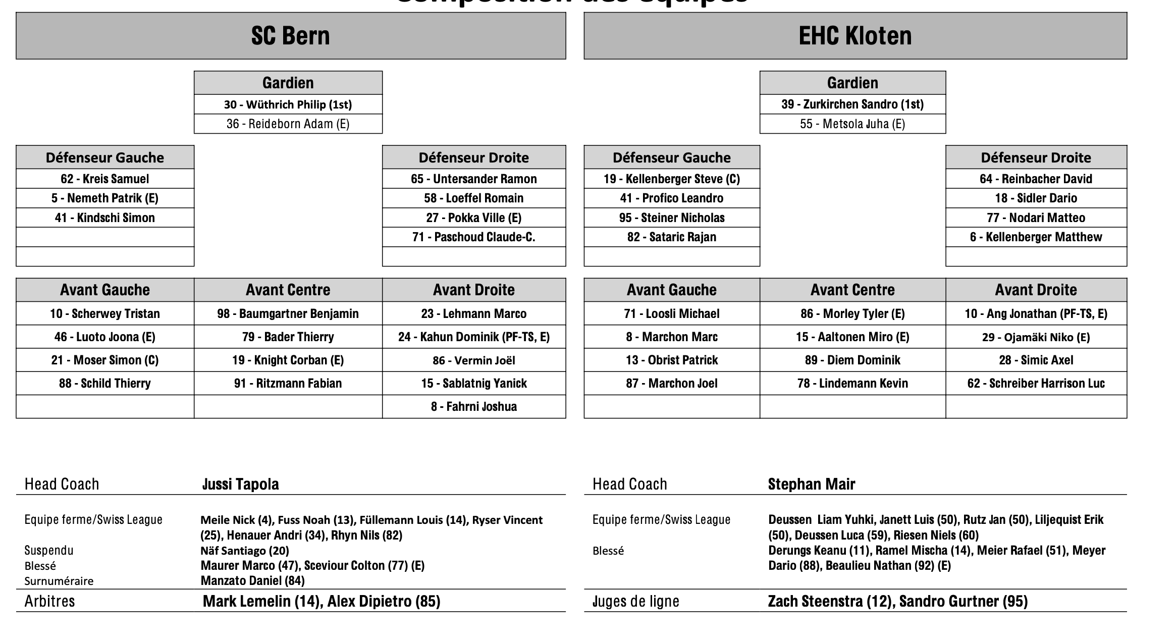 Formation des équipes et joueurs indisponibles pour le match Berne vs Kloten 02/02/2024 Follow SwissHabs Derniers articles Il y a 6 minutes Quelques semaines d'absence pour Dominic Zwerger Il y a 2 heures Les autres faits à retenir de cette nuit de NHL et de celle à venir Il y a 4 heures Fribourg a pu profiter de la vente de feu de Jukurit Il y a 4 heures Un record pour les Stars de Dallas Il y a 5 heures Les Devils s'imposent mais notre trio suisse reste muet