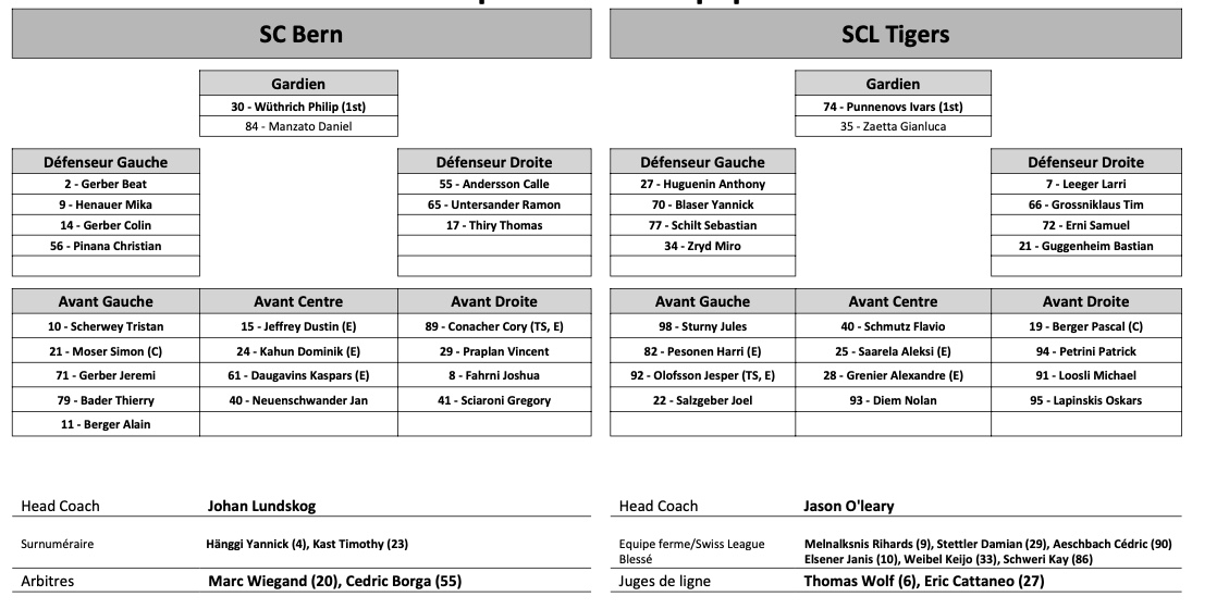 Formation des équipes et joueurs indisponibles pour le match Berne vs Langnau 17/09/2021 Follow SwissHabs Derniers articles Il y a une heure Avenir incertain pour Einar Emanuelsson après son passage à Lugano Il y a 2 heures Les autres faits à retenir de cette nuit de NHL et de celle à venir Il y a 3 heures Dan Tangnes signe un bien bel exploit avec Rögle Il y a 3 heures Une 21e saison à plus d'un point par match pour Sidney Crosby Il y a 3 heures Les Devils stoppent la série du Canadien