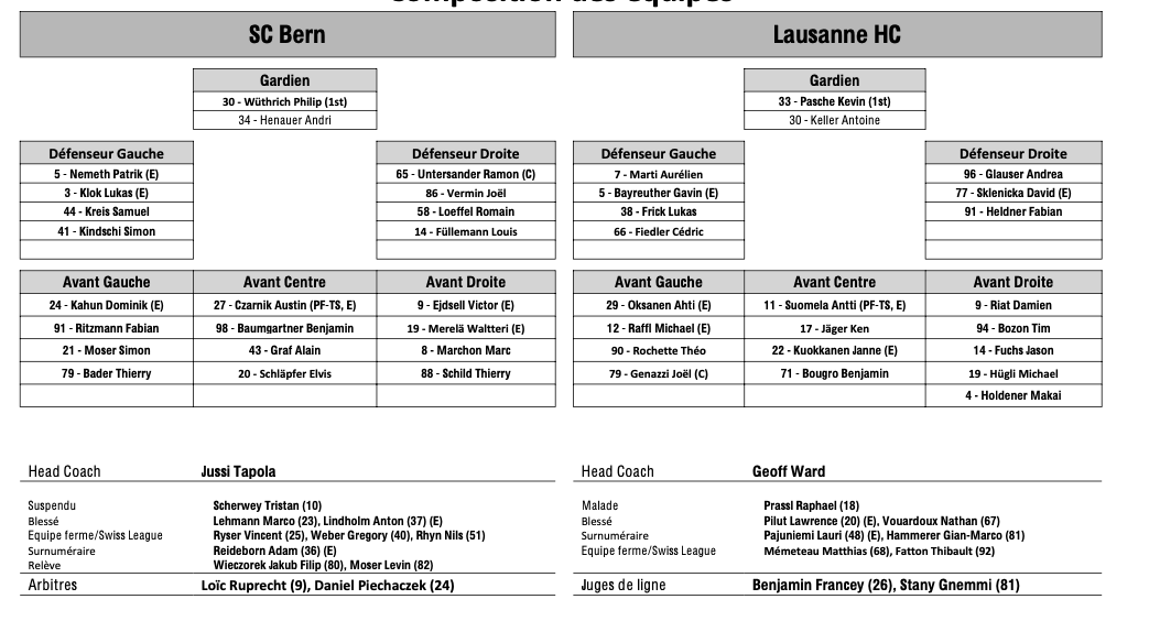 Formation des équipes et joueurs indisponibles pour le match Berne vs Lausanne 22/01/2025 Follow SwissHabs Derniers articles Il y a 5 heures Zoug dévoile son nouveau logo Il y a 5 heures Deux prolongations à Zurich Il y a 7 heures Formation des équipes et joueurs indisponibles pour le match Zurich vs Genève Il y a 7 heures Formation des équipes et joueurs indisponibles pour le match Davos vs Kloten Il y a 7 heures Formation des équipes et joueurs indisponibles pour le match Lugano vs Lausanne