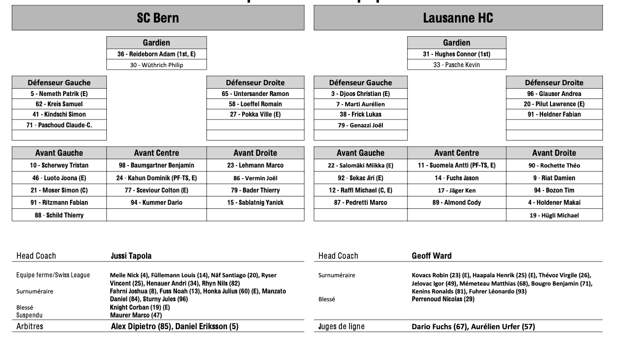 Formation des équipes et joueurs indisponibles pour le match Berne vs Lausanne 02/03/2024 Follow SwissHabs Derniers articles Il y a 14 minutes Echange entre les Flyers et le Wild Il y a 22 minutes Lars Steiner continue sa moisson de points Il y a 37 minutes Une soirée sans point pour nos Suisses de NHL Il y a 9 heures Plusieurs joueurs touchés du côté de Davos Il y a 11 heures Kevin Fiala aura un nouveau coach