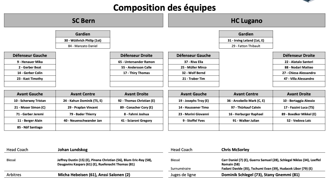 Formation des équipes et joueurs indisponibles pour le match Berne vs Lugano 06/11/2021 Follow SwissHabs Derniers articles Il y a 46 minutes Les autres faits à retenir de cette nuit de NHL Il y a 47 minutes Ovechkin défie le temps et entre encore dans l’histoire Il y a une heure Un rare combat de gardiens en NHL Il y a une heure Le point sur les play-offs de Canadian Hockey League Il y a une heure Une soirée à oublier pour nos Suisses de NHL
