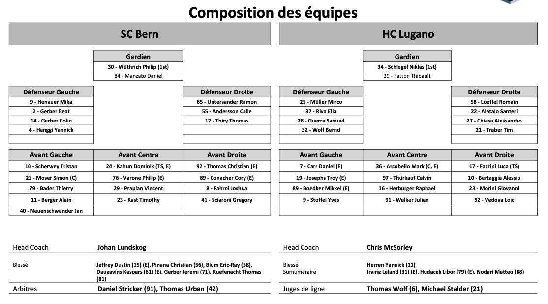 Formation des équipes et joueurs indisponibles pour le match Berne vs Lugano 04/12/2021 Follow SwissHabs Derniers articles Il y a 53 minutes Formation des équipes et joueurs indisponibles pour le match Genève vs Lausanne Il y a une heure Luc Tardif quittera la présidence de l’IIHF en octobre Il y a 4 heures Finale de Swiss League acte I : formation des équipes et joueurs indisponibles pour le match Sierre vs La Chaux-de-Fonds Il y a 6 heures « Une phase de transition » : Reto Kläy fait le point après l’élimination et se met à la quête d'un coach Il y a 6 heures Pour le plaisir : le bien joli but de Matthew Tkachuk