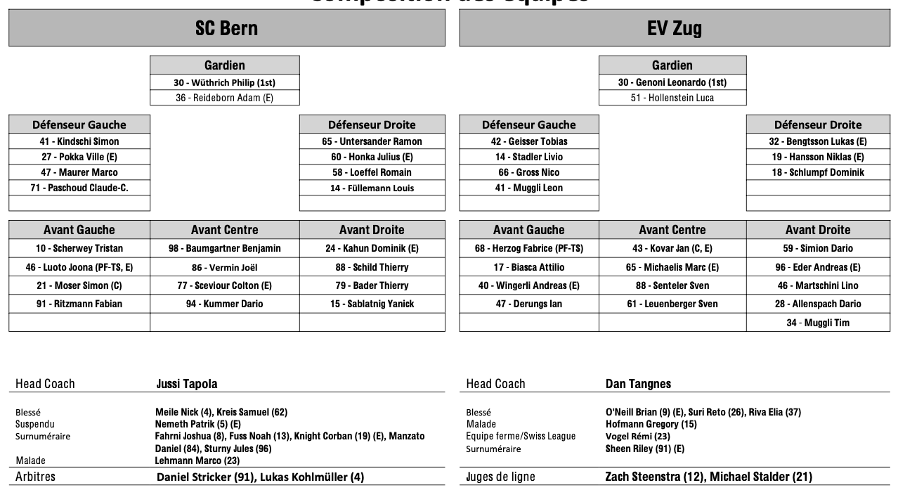 Formation des équipes et joueurs indisponibles pour le match Berne vs Zoug 23/03/2024 Follow SwissHabs Derniers articles Il y a une heure Ludvig Johnson échange régulièrement avec sa franchise de NHL Il y a 3 heures EHC Coire : Björn Gerhard a une vision claire pour l'avenir de la Swiss League Il y a 3 heures Les autres faits à retenir de cette nuit de NHL et de celle à venir Il y a 4 heures Un nouveau record d'affluence pour un match féminin aux États-Unis Il y a 4 heures Lars Steiner et Guus Van der Kaaij trouvent le fond des filets