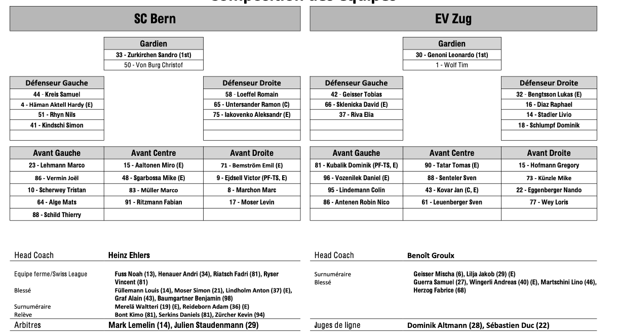 Formation des équipes et joueurs indisponibles pour le match Berne vs Zoug 05/03/2026 Follow SwissHabs Derniers articles Il y a une heure Formation des équipes et joueurs indisponibles pour le match Lugano vs Zurich Il y a une heure Formation des équipes et joueurs indisponibles pour le match Lausanne vs Davos Il y a une heure Formation des équipes et joueurs indisponibles pour le match Rapperswil vs Kloten Il y a une heure Les Maple Leafs concluent un échange avec Colorado Il y a 2 heures Formation des équipes et joueurs indisponibles pour le match Berne vs Zoug