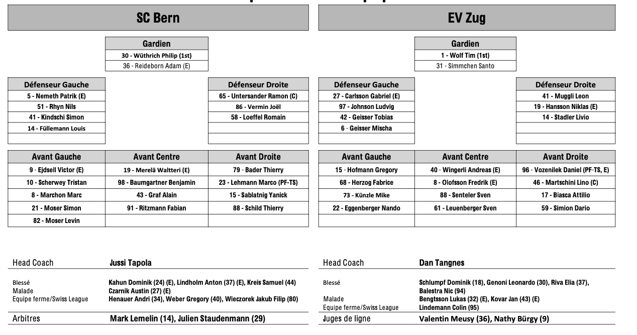 Formation des équipes et joueurs indisponibles pour le match Berne vs Zoug 16/11/2024 Follow SwissHabs Derniers articles Il y a 21 minutes Le masque de Remo Giovannini dans les détails Il y a 4 heures Quelques semaines d'absence pour Dominic Zwerger Il y a 6 heures Les autres faits à retenir de cette nuit de NHL et de celle à venir Il y a 8 heures Fribourg a pu profiter de la vente de feu de Jukurit Il y a 8 heures Un record pour les Stars de Dallas