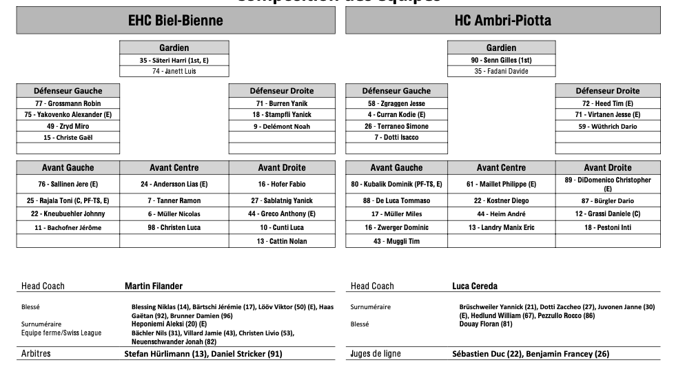 Formation des équipes et joueurs indisponibles pour le match Bienne vs Ambri 11/01/2025 Follow SwissHabs Derniers articles Il y a 5 heures Plusieurs joueurs touchés du côté de Davos Il y a 6 heures Kevin Fiala aura un nouveau coach Il y a 7 heures Pavel Rosa restera lui aussi derrière le banc du CP Berne Il y a 9 heures Simas Ignatavicius, itinéraire d’un enfant drafté Il y a 13 heures Les Swiss Devils célèbrent la cuisine helvète au New Jersey