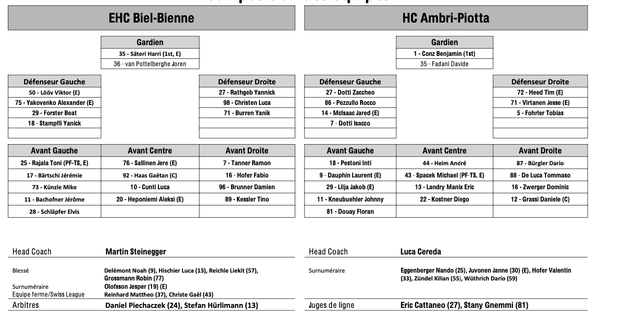 Formation des équipes et joueurs indisponibles pour le match Bienne vs Ambri 11/03/2024 Follow SwissHabs Derniers articles Il y a 54 minutes Les Swiss Devils célèbrent la cuisine helvète au New Jersey Il y a 2 heures Un match de suspension et une amende contre Jakob Lee Il y a 3 heures Davos et Fribourg joueront la ligue des champions Il y a 3 heures Ouverture d'une procédure ordinaire contre Malte Strömwall Il y a 4 heures Emil Pettersson suscite de l'intérêt sur le marché suisse
