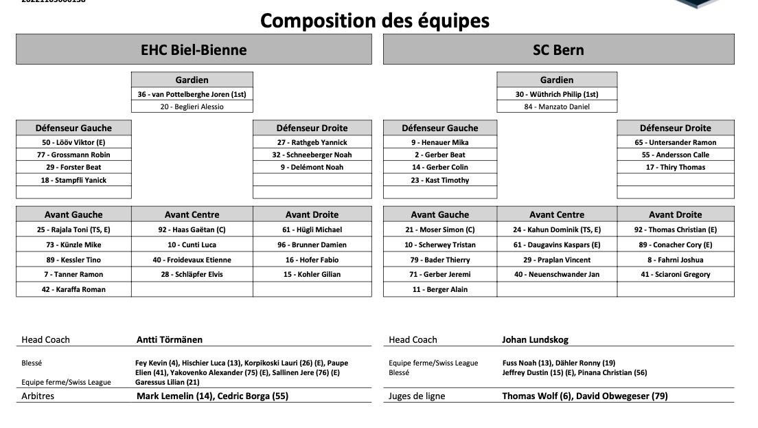 Formation des équipes et joueurs indisponibles pour le match Bienne vs Berne 05/11/2021 Follow SwissHabs Derniers articles Il y a 3 heures Les autres faits à retenir de cette nuit de NHL Il y a 3 heures Ovechkin défie le temps et entre encore dans l’histoire Il y a 4 heures Un rare combat de gardiens en NHL Il y a 4 heures Le point sur les play-offs de Canadian Hockey League Il y a 4 heures Une soirée à oublier pour nos Suisses de NHL